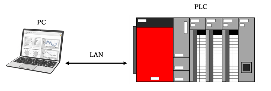 構築したPC側のインターフェースとPLCをイーサネットにより通信を行ってシステムを構築致します。