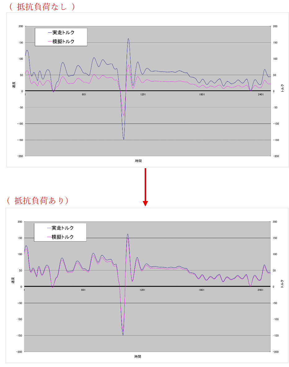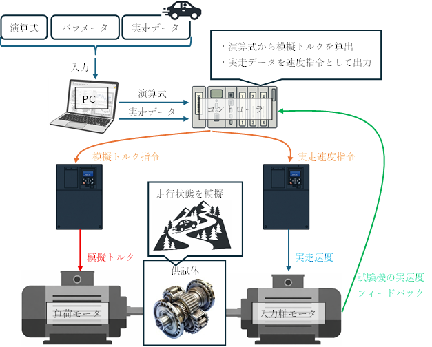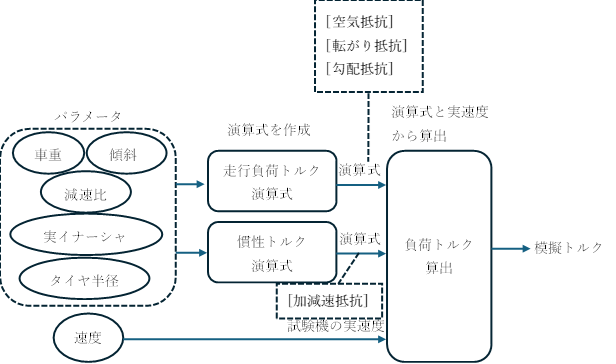 - 制御コントローラにて実装データの速度変化に応じた走行抵抗トルクを計算して模擬します。