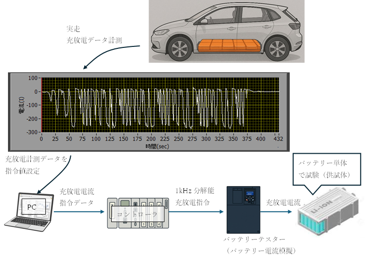 実車走行で計測したバッテリーの充放電データを制御値に変換して、バッテリー単体の充放電試験を行います。