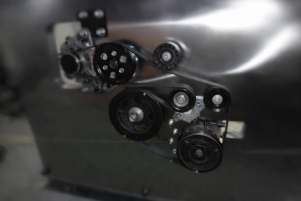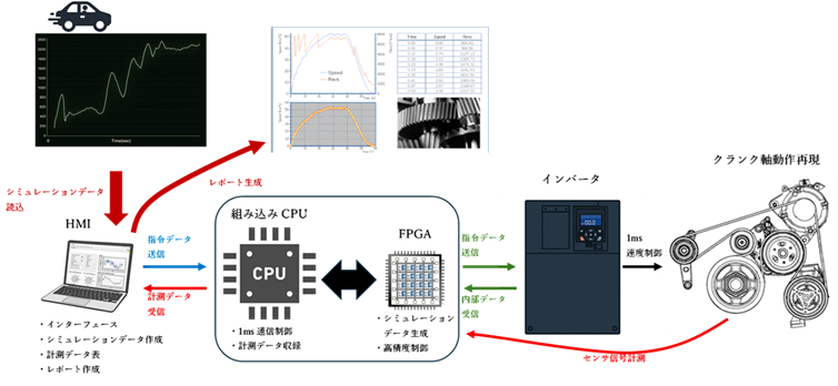 クランク軸の速度とトルクの実車走行時データを制御値に変換して、エンジン周りの部品の負荷試験を行います。